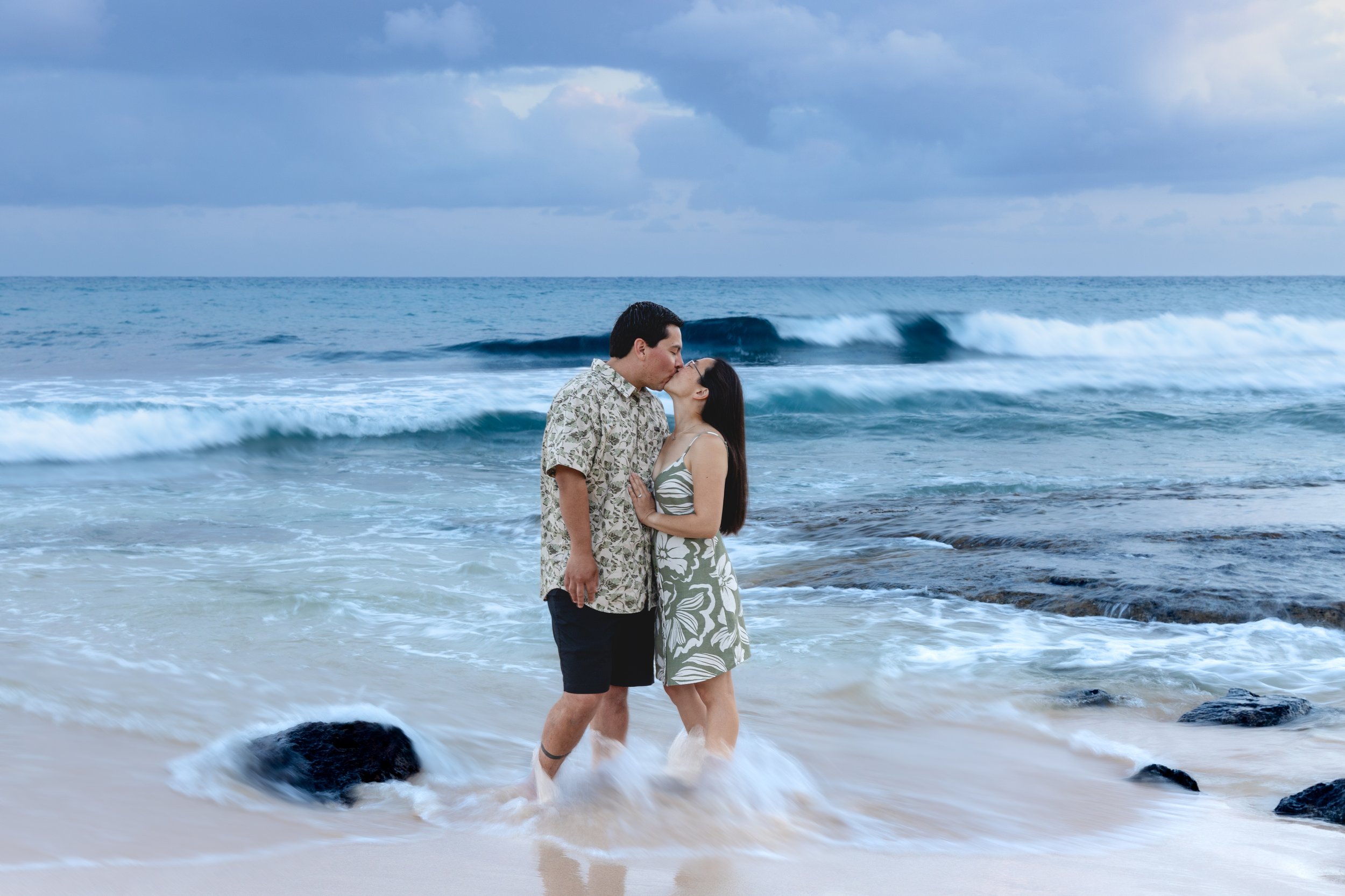 As the sky shifted from coral to a deeper blue, the energy shifted too. They kissed and had special moments each other, with waves breaking behind them and the water blurring around their feet.